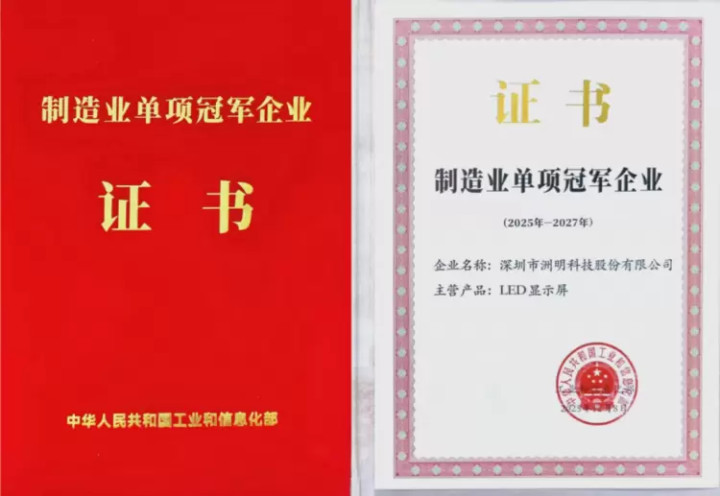 “深圳市洲明科技股份有限公司旗下LED显示屏产品成功通过工信部复核,再次荣获‘制造业单项冠军’称号。”