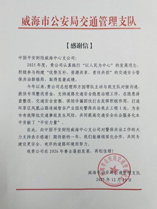 近日,平安产险威海中心支公司收到威海市公安局交通管理支队发来的感谢信,信中对平安产险威海中心支公司在2025年度交通安全警保共治工作中的突出贡献予以高度肯定与诚挚感谢。